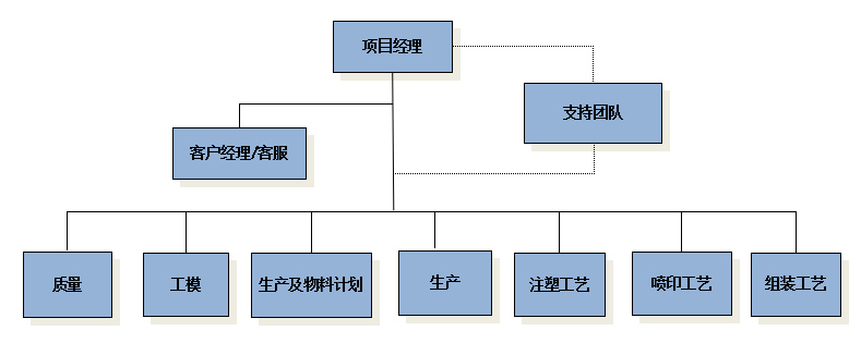 Support team: includes all department managers and key supervisors of key posts, offering resources required by the project